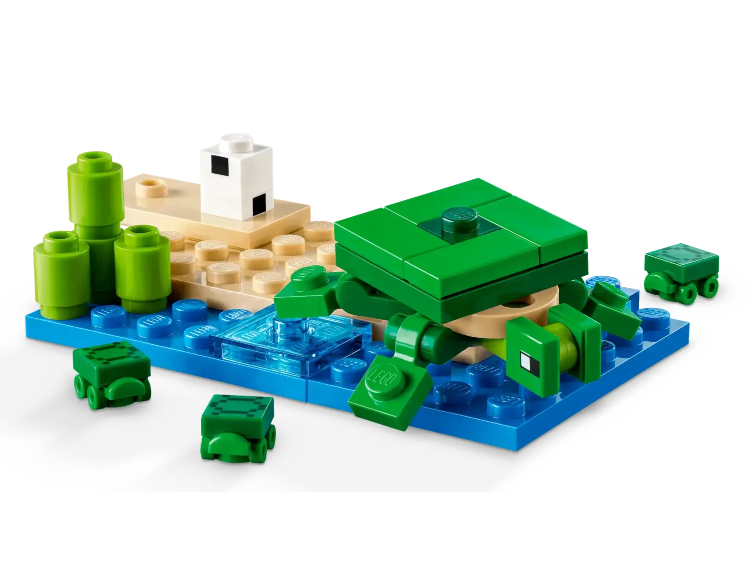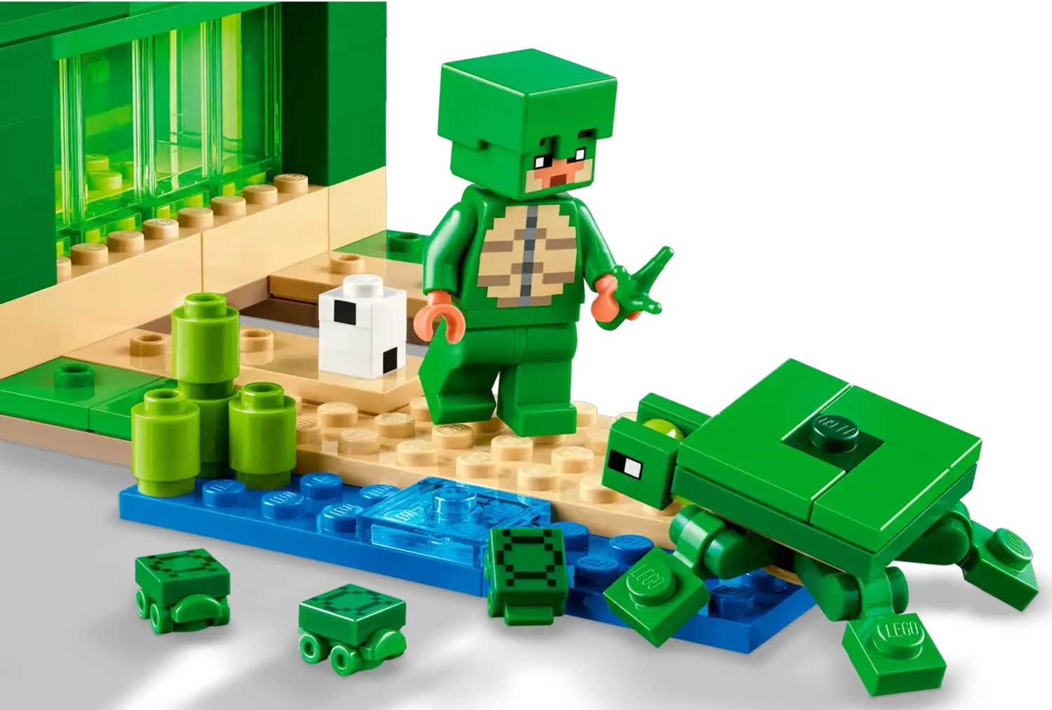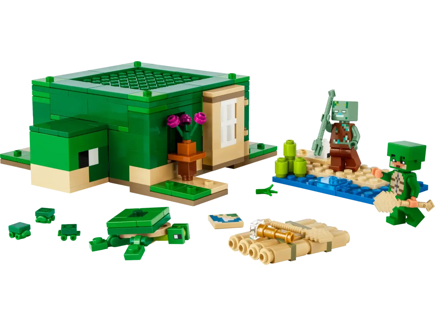 Игроки строят дом Minecraft в форме черепахи с окнами, фонарями, дверью, кроватью, столом, верстаком и печью. Подъемная крыша обеспечивает легкий доступ внутрь. Снаружи есть пляж с сахарным тростником, черепашьими яйцами и бамбуковым плотом с веслами. Есть знакомые фигурки и мобы Minecraft: Воин Черепаховой Шкуры в черепашьей шкуре и шлеме, Утопленник с трезубцем, Черепаха, грызущая морскую траву, и 3 черепахи-детеныша. Среди других аксессуаров этой игрушки для геймеров — подзорная труба и карта. Любителям игровых действий, творческого конструирования и ухода за животными понравится эта универсальная игрушка. Для большего цифрового удовольствия приложение LEGO Builder позволяет строителям увеличивать масштаб, вращать модели в 3D и отслеживать их прогресс.