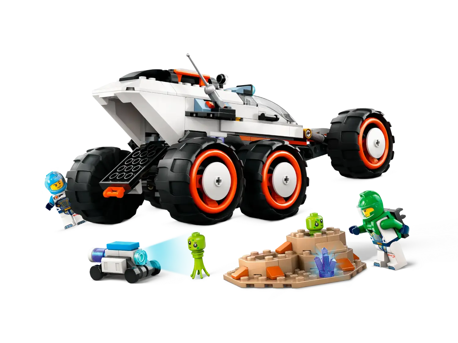 Футуристический космический автомобиль для творческих игр. Модель космического вездехода оснащена детализированной кабиной для двух человек, имеет 6 колес с большими шинами и усовершенствованную подвеску для путешествий по чужеродным планетам.