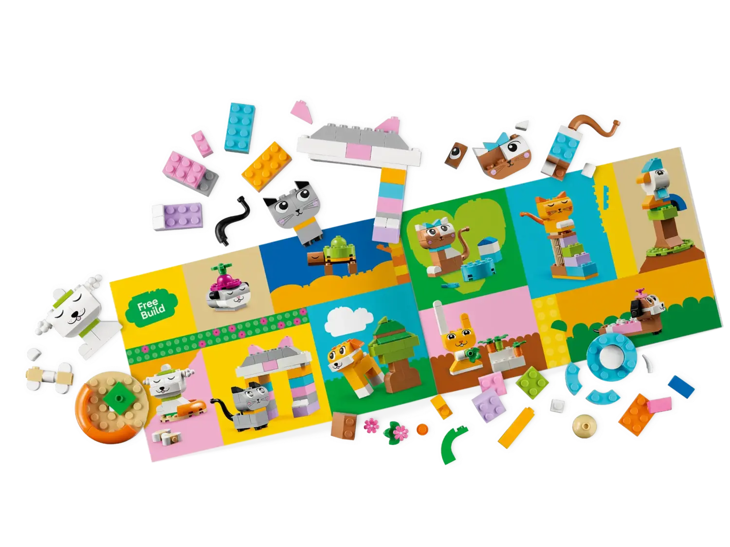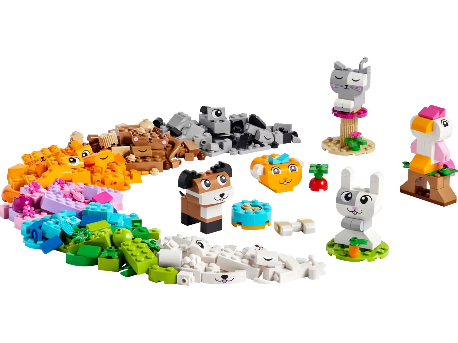 С помощью 450 кубиков LEGO, в том числе специальных деталей с глазами и ртами, а также простых пошаговых инструкций, дети смогут собрать собаку из миски и кости, кошку на подставке, хомяка с яблоком, кролика с морковь и птица на жердочке. Затем, используя включенные в набор предложения по альтернативным цветам, формам и функциям, дети смогут воссоздать своих питомцев по-новому и весело. По мере развития творческих навыков дети смогут воплощать в жизнь свои собственные идеи. В комплект входит руководство, содержащее 10 идей, которые помогут начать увлекательное занятие по сборке.