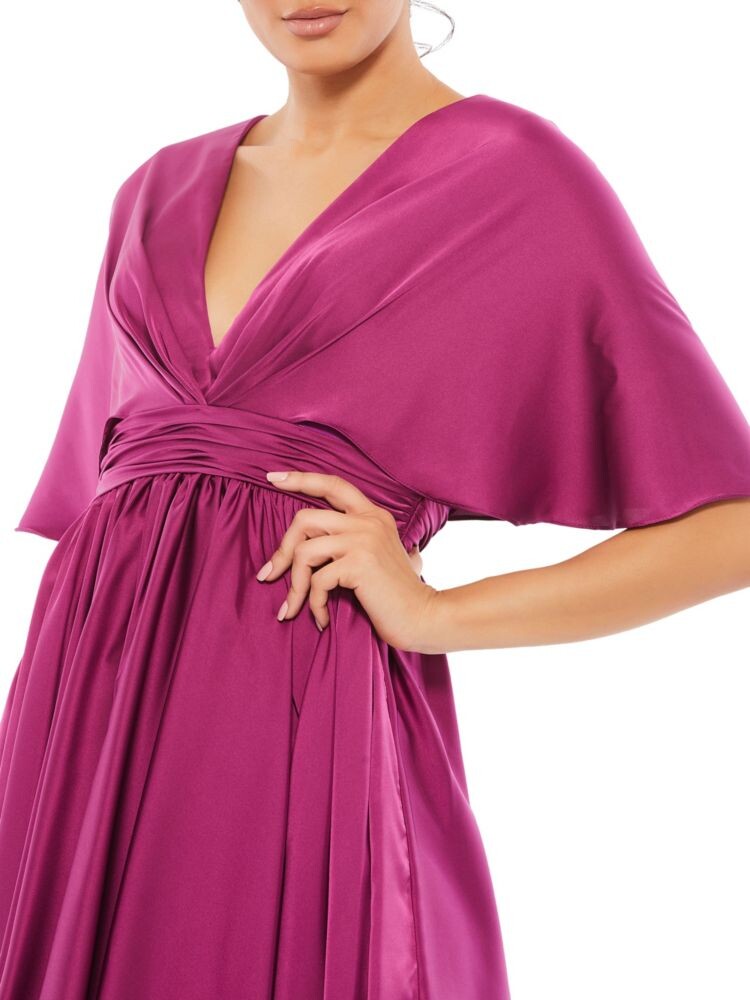 • Глубокий V-образный вырез. Короткие рукава-накидки. Молния сзади. Плиссированная талия. На подкладке. Полиэстер. Чистка пятен.