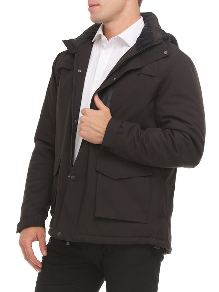 • Съемный капюшон на шнурке. Длинные рукава с ремешками на ремешке. Застежка-молния спереди. Три передних кармана на молнии. Один внутренний карман на молнии. Четыре ультратонких нагревательных панели с тремя настройками.