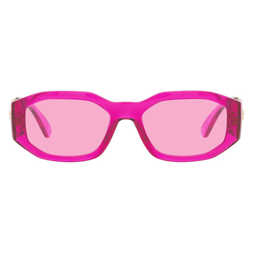 Прозрачные солнцезащитные очки цвета фуксии с линзами цвета фуксии от Versace.