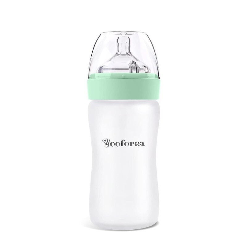 Детская бутылочка Yooforea с мягким силиконовым покрытием. В случае, если бутылка случайно разобьется, мягкое силиконовое покрытие удержит внутри осколки стекла. Мягкая соска растягивается, сгибается и сцеживается точно так же, как грудь, что способствует естественному захвату и здоровому кормлению