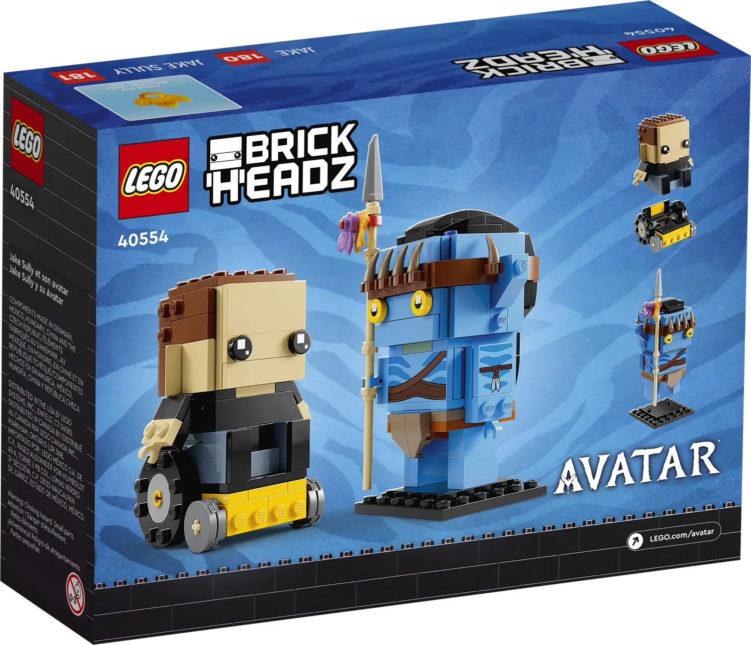 Поклонникам LEGO BrickHeadz и любителям фильмов «Аватар» понравится этот набор «Джейк Салли и его Аватар» (40554), в котором Джейк изображен в человеческом обличье, в прикрепляемой инвалидной коляске, а также в виде Аватара с копьем На'ви. Обе версии персонажей представлены на прочных основаниях, поэтому они идеально подходят как для игры, так и для демонстрации. Коллекционеры наборов LEGO BrickHeadz также могут весело провести время, комбинируя модели и создавая собственных сумасшедших гибридных персонажей.