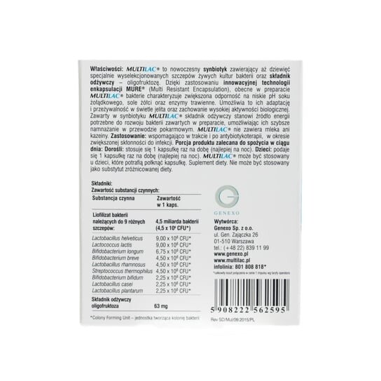 Препарат содержит бактерии, характеризующиеся повышенная устойчивость к низкому pH желудочного сока, пищеварительных ферментов и солей желчных кислот, что обеспечивает их адаптацию и выживание в просвете кишечника, сохраняя при этом высокую биологическую активность. Питательное вещество мультилак, содержащееся в препарате, является источником энергии, необходимой для развития содержащихся в препарате бактерий, что способствует более быстрому их размножению в пищеварительном тракте. Штаммы бактерий, содержащиеся в препарате, обладают способностью расщеплять лактозу до простых сахаров, что полезно для людей с лактазной недостаточностью, не переносящих молоко и продукты из него. Синбиотик рекомендуется в качестве вспомогательного средства во время и после антибиотикотерапии, а также в периоды повышенной склонности к инфекциям.