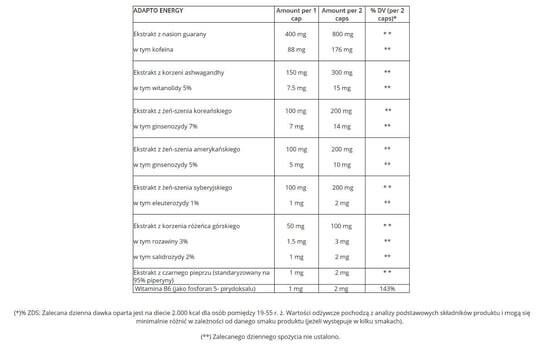ADAPTO ENERGY Количество на 1 капсулу Количество на 2 капсул % дневной нормы (на 2 капсулы)*Экстракт семян гуараны
