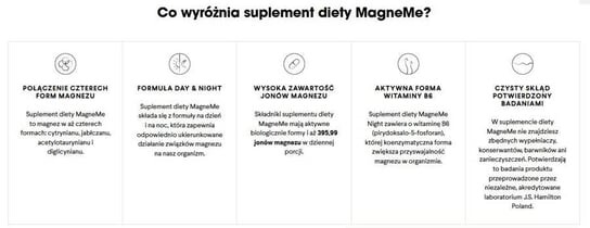 MagneMe Day Магниевые соли лимонной кислоты (магний), глазирующий агент: гидроксипропилметилцеллюлоза, рисовый крахмал, антислеживатель: диоксид кремния. MagneMe Night Бисглицинат магния (магний), ATA Mg - ацетилтаурат магния (магний), малат магния (магний), глазирующий агент: гидроксипропилметилцеллюлоза, пиридоксаль-5-фосфат (витамин В6), антислеживатель: диоксид кремния. Инструкция по применению Рекомендуемая суточная доза, необходимая для получения положительного эффекта: 2 капсулы MagneMe Day утром (в упаковке 30 порций) 2 капсулы MagneMe Night вечером (в упаковке 30 порций) Противопоказания: Продукт не может использоваться в качестве замены разнообразного питания. Сбалансированное питание и здоровый образ жизни являются основой правильного функционирования организма. Не превышайте рекомендуемую суточную дозу. Если вы принимаете лекарства или другие пищевые добавки, проконсультируйтесь с врачом. Хранение: Хранить при комнатной температуре. Берегите от влаги. Хранить в недоступном для маленьких детей месте.