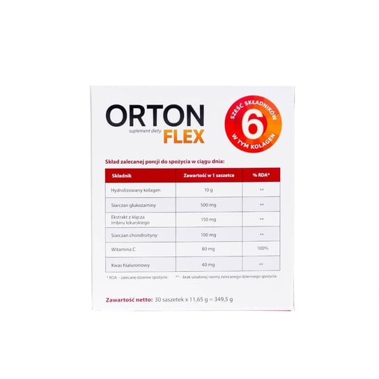 Ортон Флекс — биологически активная добавка, содержащая в композиции целых 6 активных ингредиентов: коллаген, гиалуроновую кислоту, глюкозамин, хондроитин, экстракт имбиря и витамин С.