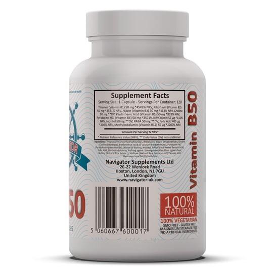 Питательные вещества на порцию (1 капсула): тиамина гидрохлорид (витамин B1) – 50 мг *45–45% RWS; рибофлавин (витамин В2) – 50 мг *3571% рекомендуемой суточной нормы; ниацин (витамин B3) – 50 мг *313% рекомендуемой суточной нормы; холин («витамин В4») – 50 мг **ДДН; d-пантотенат кальция (витамин В5) – 50 мг *833% рекомендуемой суточной нормы; пиридоксина гидрохлорид (витамин В6) – 50 мг *3571% рекомендуемой суточной нормы; биотин («витамин В7») — 55 мкг *110% рекомендуемой суточной нормы; инозитол («витамин В8») – 50 мг **ДДН; фолиевая кислота («витамин В9») – 400 мкг *200% СВВ; п-аминобензойная кислота (ПАБА, «витамин В10») — 50 мг **ДДН; метилкобаламин (витамин В12) – 55 мкг *2200% рекомендуемой суточной нормы; * Справочная суточная норма для взрослых; ** Суточная доза не определена.
