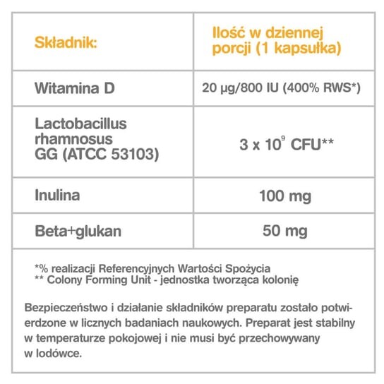 Ингредиенты: инулин, гидроксипропилметилцеллюлоза, лактоферрин коровьего молока, Lactobacillus rhamnosus GG (ATCC 53103), модифицированный крахмал, антислеживатель: магниевые соли жирных кислот, краситель: диоксид титана, сахароза, антиоксидант: аскорбат натрия, триглицериды со средней длиной цепи, связующее вещество. : диоксид кремния, антиоксидант: альфа-токоферол, краситель: оксиды и гидроксиды железа, витамин D (холекальциферол)