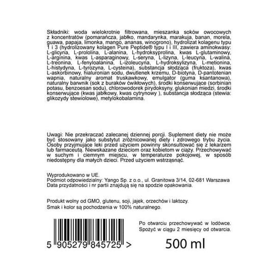 Состав: многократно фильтрованная вода, смесь фруктовых соков из концентраты (апельсин, яблоко, мандарин, маракуйя, банан, абрикос, гуава, папайя, лайм, манго, ананас, виноград), гидролизат коллагена 1 и 3 типа (гидролизованный коллаген Pure Peptide типа 1 и 3, содержит аминокислоты: L -глицин, L-прололин, L-аланин, L-гидроксипролин, L-глутаминовая кислота, L-аргинин, L-аспарагиновая кислота, L-серин, L-лизин, L-лейцин, L-валин, L-треонин, L -фенилаланин, L-изолейцин, L-гидроксилизин, L-метионин, L-гистидин, L-тирозин, L-цистеин), подсластитель (фруктоза), L-аскорбиновая кислота, гиалуронат натрия, диоксид кремния, D-биотин, d- пантотенат кальция, натуральный клубничный ароматизатор, эмульгатор (ксантановая камедь), натуральный краситель (свекольный сок), консерванты (сорбат калия, бензоат натрия), гидрохлорид пиридоксина, глюконат меди, консерванты (яблочная кислота, лимонная кислота), подсластитель (стевия: гликозиды стевиола). ), метилкобаламин.
