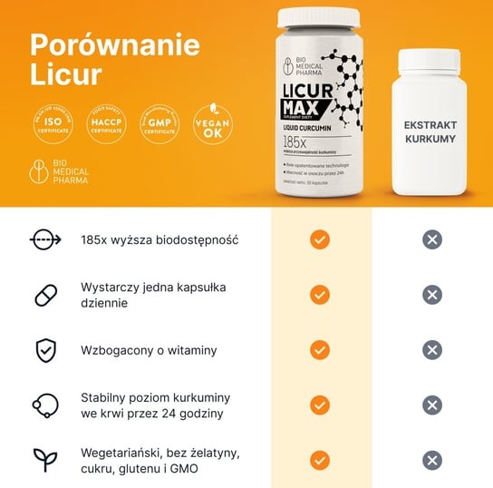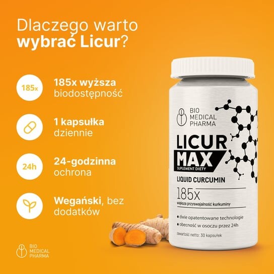 Licur MAX отличается НОВЫМ ВЫСОКИМ содержанием мицеллярного куркумина NovaSOL Curcumin с рекордной усвояемостью в современной форме. Исследования показывают, что благодаря инновационной форме мицеллярной солюбилизации куркумин NovaSOL, содержащийся в Licur MAX, усваивается в 185 раз лучше, чем стандартизированный экстракт куркумина, и остается в плазме крови в течение 24 часов. Куркумин — это природное полифенольное соединение, полученное из корневища куркумы, также известной как индийская куркума, растения из семейства имбирных, проявляющего широкий спектр биологических эффектов. Куркумин – основное действующее вещество куркумы, его необыкновенные свойства уже тысячи лет известны на Дальнем Востоке, где живительная пряность широко используется и пользуется большой популярностью. Индийцы верят, что хотя куркумин и не является лекарством, он обладает природной силой одного из сильнейших антиоксидантов, помогая повысить эффективность ферментов, отвечающих за защиту от воздействия свободных радикалов (окислительного стресса). Благодаря передовым технологическим решениям LICUR MAX является одной из самых современных биологически активных добавок на рынке. БИОДОСТУПНОСТЬ КУРКУМИНА Одной из проблем, связанных с добавлением куркумина, является его биодоступность. Даже при высоких дозах самого куркумина в организм попадают лишь следовые количества, и это связано с тем, что куркумин имеет быстрый метаболический обмен в печени и стенках кишечника. Большинство веществ растительного происхождения, в том числе гликозидные производные полифенолов, такие как куркумин, хорошо растворяются в воде. Однако он недостаточно усваивается из-за слишком большого размера молекулы, невозможности проникновения путем пассивной диффузии или неспособности смешиваться и растворяться в липидах клеточных мембран. Куркумин, содержащийся в LICUR MAX, разработан таким образом, что вещество усваивается в 185 раз лучше, чем стандартизированный экстракт куркумы, и сохраняется в плазме крови в течение 24 часов. LICUR MAX представил формулу Crystal Clear Solution, которая обеспечивает полное растворение вещества, гарантируя его максимальное использование и усвоение организмом. Кристаллически прозрачный раствор, видимый невооруженным глазом, получен благодаря самым передовым технологическим и фармакологическим решениям. Запатентованная формула капсул Licaps Капсулы Licaps разработаны на основе инновационных фармакологических решений, позволяющих максимально ускорить процесс всасывания активных веществ в организм и обеспечить максимально быстрое их действие. Уникальная оболочка капсулы растворяется после проглатывания, высвобождая свое содержимое всего за несколько минут. Благодаря этому мы можем быть уверены, что максимум активных веществ усвоится организмом.