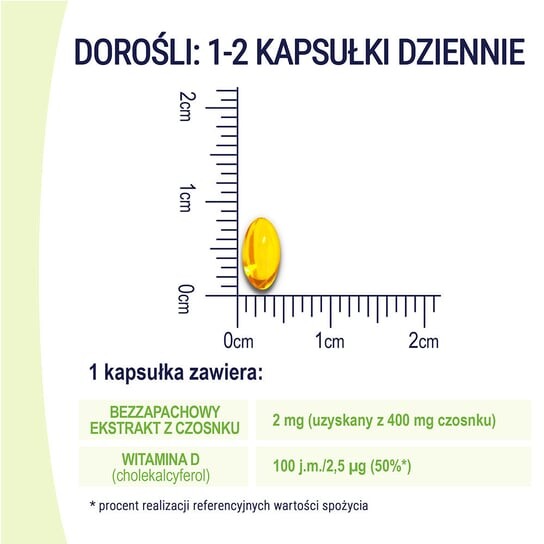 Состав: масло растительное: рафинированное соевое масло; желатин; гелеобразователи: глицерин, диоксид кремния; экстракт чеснока без запаха; витамин D (холекальциферол)