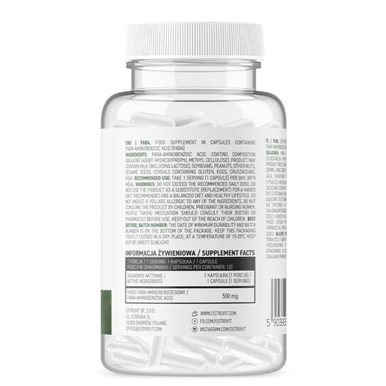 OstroVit ПАБА – биологически активная добавка в капсулах с очень широким оздоровительным действием. Используемая в продукте парааминобензойная кислота, также известная как витамин B10, поддерживает выработку и усвоение многих ценных питательных веществ, включая фолиевую кислоту и другие витамины группы B. Вы ищете добавку, которая замедлит процесс старения и защитит ваш организм? защищает кожу от вредного УФ-излучения и улучшает усвоение витаминов и минералов в организме? Капсулы OstroVit PABA обязательно помогут вам в этом.