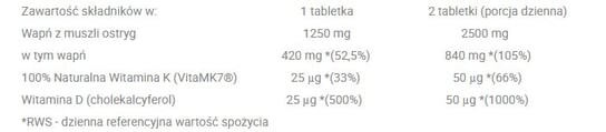Кальций (карбонат кальция из раковин устриц), целлюлоза микрокристаллическая (наполнитель), клетчатка акации, витамин К2 (ВитаМК7), менахинон-7, витамин D3 (холекальциферол).Способ применения: Рекомендуемая суточная порция, необходимая для получения полезного эффекта: 1-2 таблетки. в день во время еды (в упаковке 100 порций) Противопоказания: Продукт не может использоваться в качестве замены разнообразного питания. Сбалансированное питание и здоровый образ жизни являются основой правильного функционирования организма. Не превышайте рекомендуемую суточную дозу. Если вы принимаете лекарства или другие биологически активные добавки, проконсультируйтесь с врачом. Перед применением желательно сдать анализ крови на 25-(OH)D и проконсультироваться о результате с врачом или фармацевтом. Продукт не следует использовать людям, принимающим антикоагулянты, содержащие антагонисты витамина К (например, варфарин и аценокумарол). Хранение: Хранить при комнатной температуре. Берегите от влаги. Хранить в недоступном для маленьких детей месте.