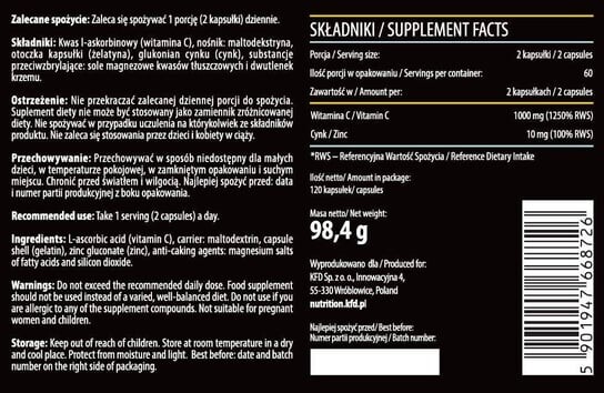 — продукт, который является источником витамина С и источником цинка, обеспечивая суточную дозу до 1000 мг витамина С и 10 мг цинка (100% RWS) в удобной форме капсул. Продукт содержит только самые необходимые ингредиенты, мы использовали органическую форму цинка (глюконат), а капсула состоит из натурального желатина без красителей.