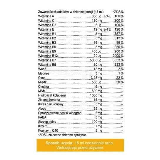Состав: мультифильтрованная вода; смесь натуральных фруктовых соков из концентратов (апельсиновый, яблочный, мандариновый, гуава, папайя, лайм, манго, ананас, виноград); подсластители (фруктоза); гидролизат коллагена (содержит аминокислоты: L-глицин, L-пролин, L-аланин, L-гидроксипролин, L-глутаминовая кислота, L-аргинин, L-аспарагиновая кислота, L-серин, L-лизин, L-лейцин, л - валин, L-треонин, L-фенилаланин, L-изолейцин, L-гидроксилизин, L-метионин, L-гистидин, L-тирозин, L-цистеин); метилсульфонилметан; натуральные ароматизаторы (апельсин и клубника); глюконат кальция; l-аскорбиновая кислота; консерванты (лимонная кислота, яблочная кислота); глюконат магния; глюконат цинка; dl-альфа-токоферилацетат; пантотеновая кислота; консервант (сорбат калия, бензоат натрия); ниацин; диоксид кремния; натуральные ароматизаторы (апельсин, клубника); L-битартрат холина; коэнзим Q10 (убихинон); биотин; пиридоксина гидрохлорид; рибофлавин; тиамина гидрохлорид; аминобензойная кислота (ПАБА); теринилпальмитат, холекальциферол; глюконат меди; эмульгатор (ксантановая камедь); гиалуронат натрия; подсластитель (стевиолгликозиды); порошок алоэ; порошкообразный зеленый чай; измельченные виноградные косточки; хвощ; бета-каротин; натуральный ароматизатор (ваниль); Фолиевая кислота; цианокобаламин.