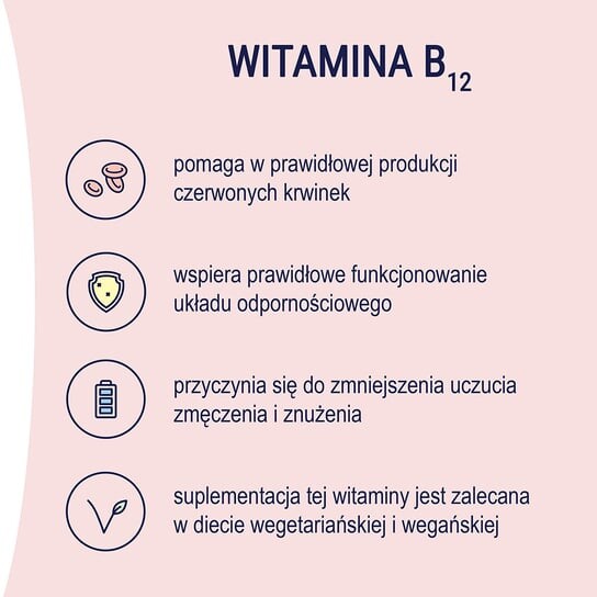 БАД поддерживает работу иммунной системы, устраняет чувство усталости и усталости, принимает участие в выработке эритроцитов. В одной таблетке содержится до 100 мкг цианокобаламина.