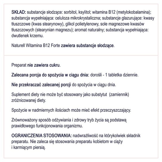 Состав: наполнители: целлюлоза (микрокристаллическая целлюлоза), фосфаты кальция (дикальцийфосфат), маннит; антислеживатель: магниевые соли жирных кислот (стеарат магния); глазирующий агент: гидроксипропилметилцеллюлоза; витамин B12 (цианокобаламин).