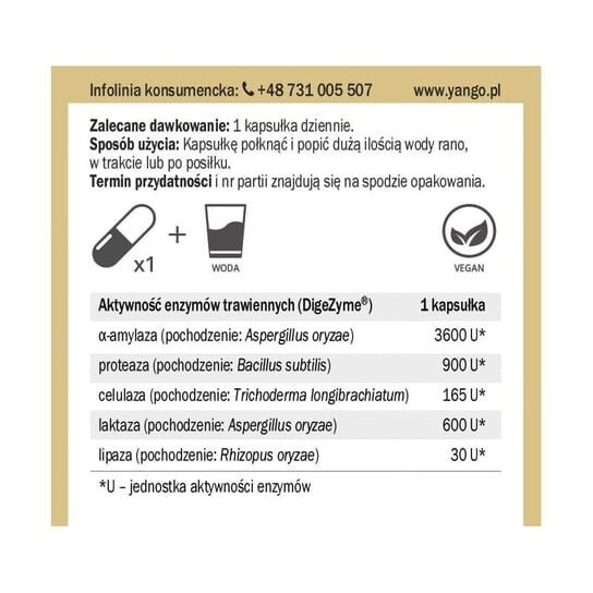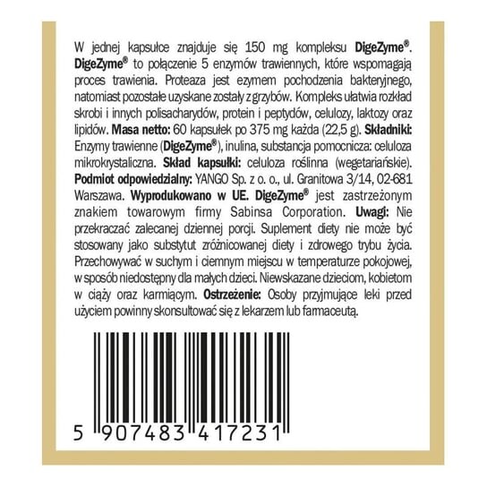 Ответственное лицо: Yango Sp. з о.о. улица Гранитова 3/14, 02-681 Варшава. Сделано в ЕС. DigeZyme является зарегистрированной торговой маркой Sabinsa Corporation.