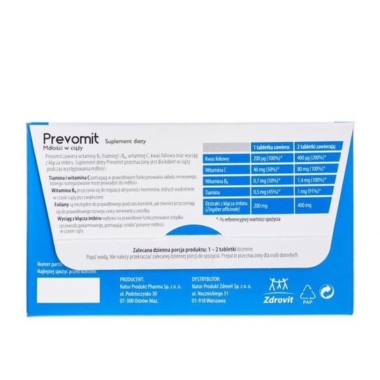 Состав: экстракт имбиря, наполнители: целлюлоза и сорбиты, L-аскорбиновая кислота (витамин С), антислеживатель: магниевые соли жирных кислот, пиридоксина гидрохлорид (витамин В6), тиамина мононитрат (витамин В1), птероилмоноглутаминовая кислота (фолиевая кислота), оболочка (загустители: гидроксипропилметилцеллюлоза и гидроксипропилцеллюлоза, связующее: тальк, краситель: Е171)
