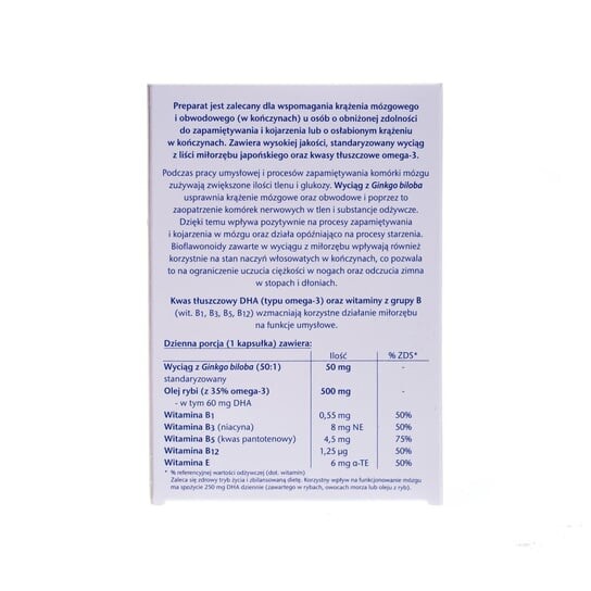 Биологически активная добавка содержит высококачественный стандартизированный экстракт листьев гинкго билоба и жирные кислоты омега-3.