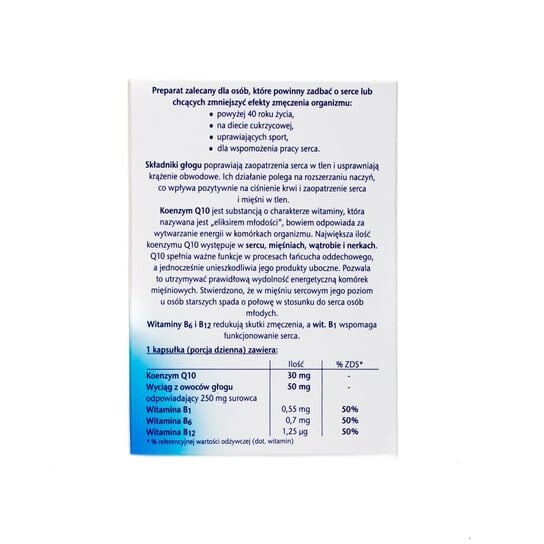 Состав: соевое масло, желатин, плоды боярышника. экстракт (5:1) (Crataegus leavigata) 12% от массы капсулы, частично гидрогенизированное соевое масло (носитель), убихинон (коэнзим Q10) 7% от массы капсулы, глицерин и сорбит (увлажнители), желтый пчелиный воск (анти- слеживающий агент), соевый лецитин (эмульгатор), цианокобаламин (вит. В12), титана диоксид (краситель), пиридоксина гидрохлорид (вит. В6), тиамина мононитрат (вит. В1), медно-хлорофиллиновый комплекс (краситель)