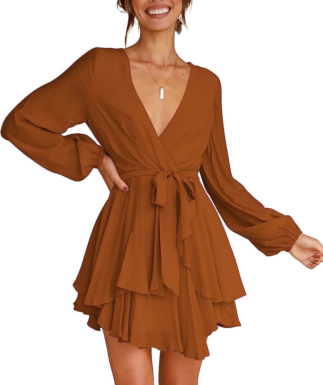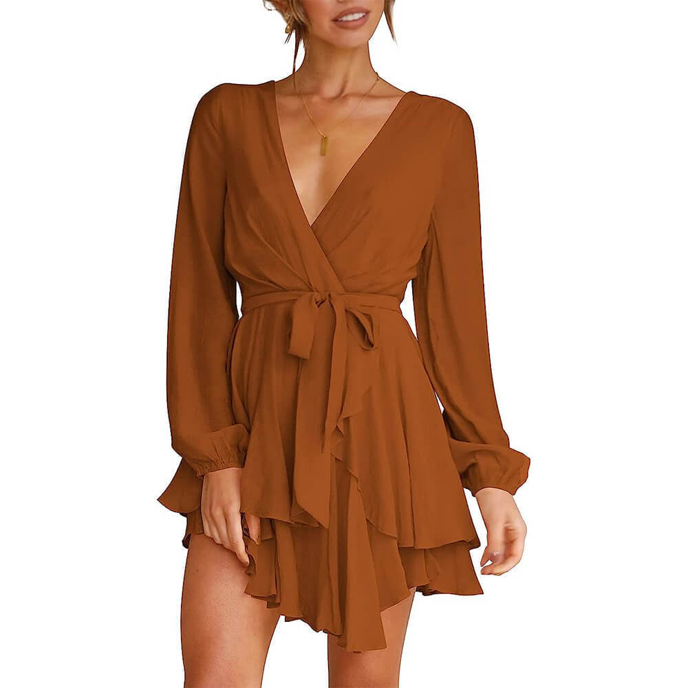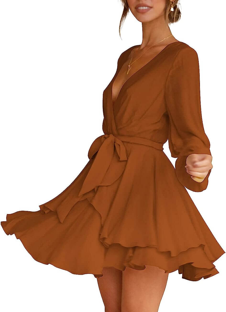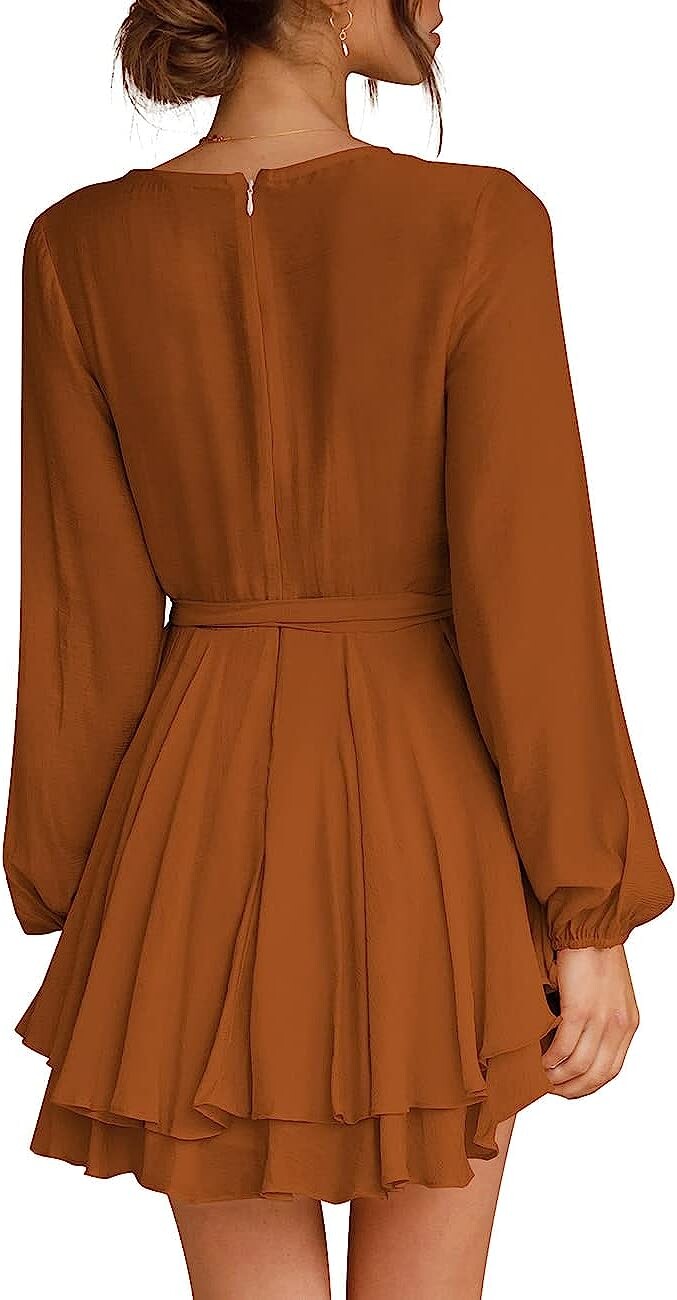 Особенности: глубокий V-образный вырез, завязка на талии, застежка-молния сзади, длинный рукав, расклешенный низ, высокая талия