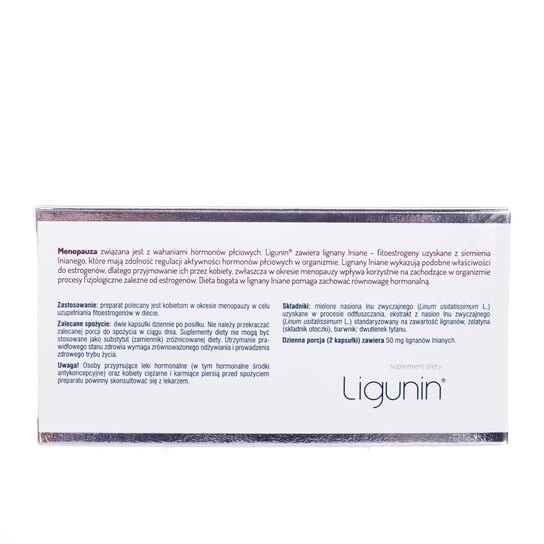 Препарат создан для женщин в период менопаузы для дополнения рациона фитоэстрогенами. Он очень хорошо регулирует гормональный баланс. Капсулы содержат лигнаны льняного семени и фитоэстрогены, полученные из семян льна, которые обладают способностью регулировать активность половых гормонов в организме. Лигнаны льняного семени обладают свойствами, сходными с эстрогенами, поэтому их прием женщинами, особенно в период менопаузы, благотворно влияет на эстрогензависимые физиологические процессы, происходящие в организме. Дополнительно Лигунин помогает нейтрализовать свободные радикалы.
