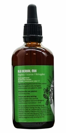 Травяной экстракт ALA Herbal Mix – это высококачественный диетический продукт. добавка, содержащая его состав, представляет собой глицериновый мацерат, изготовленный из корня дягиля китайского, корня солодки (Glycyrrhizae glabra) и корня астрагала (Astragalus membranceus).