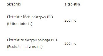 Состав: БИО-экстракт листьев крапивы (Urtica dioica L.) 200 мг, БИО-экстракт хвоща полевого (Equisetum arvense L.) 200 мг, наполнитель: БИО волокно акации, микрокристаллическая целлюлоза