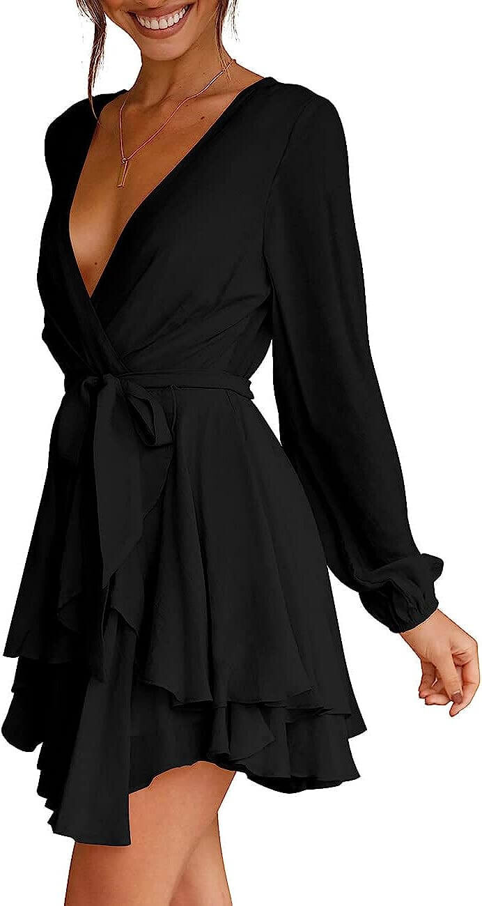 Особенности: глубокий V-образный вырез, завязка на талии, застежка-молния сзади, длинный рукав, расклешенный низ, высокая талия