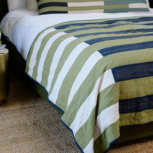 Одеяло в полоску Offset Stripe, вдохновленное классическим узором в виде кабаны, изготовлено из хлопка ручной работы и отделано традиционной строчкой Канта.