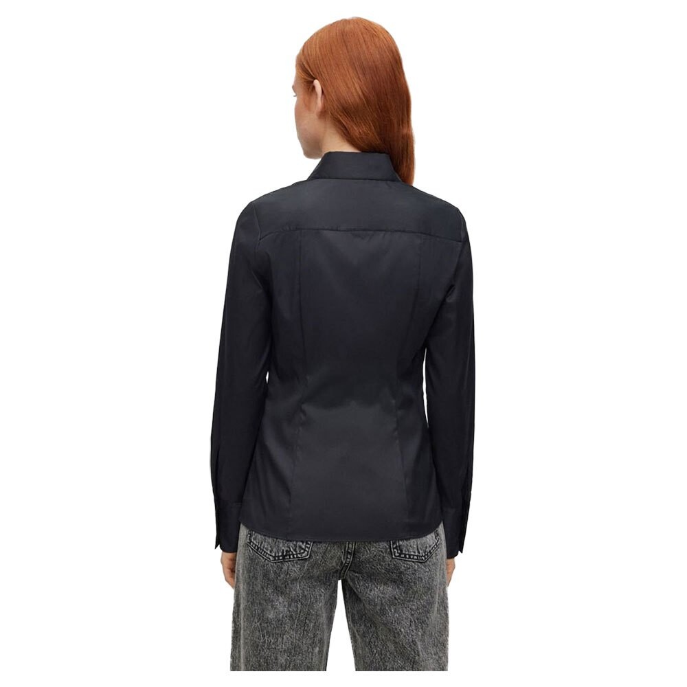 Универсальная блузка строгого кроя от HUGO Womenswear. Эта блузка с длинными рукавами, выполненная из эластичного хлопкового поплина с отделкой, которую легко гладить, имеет манжеты на пуговицах и остроконечный воротник, придающие эффектный вид. Формирующие вытачки подчеркивают обтекаемый крой этой рубашки.