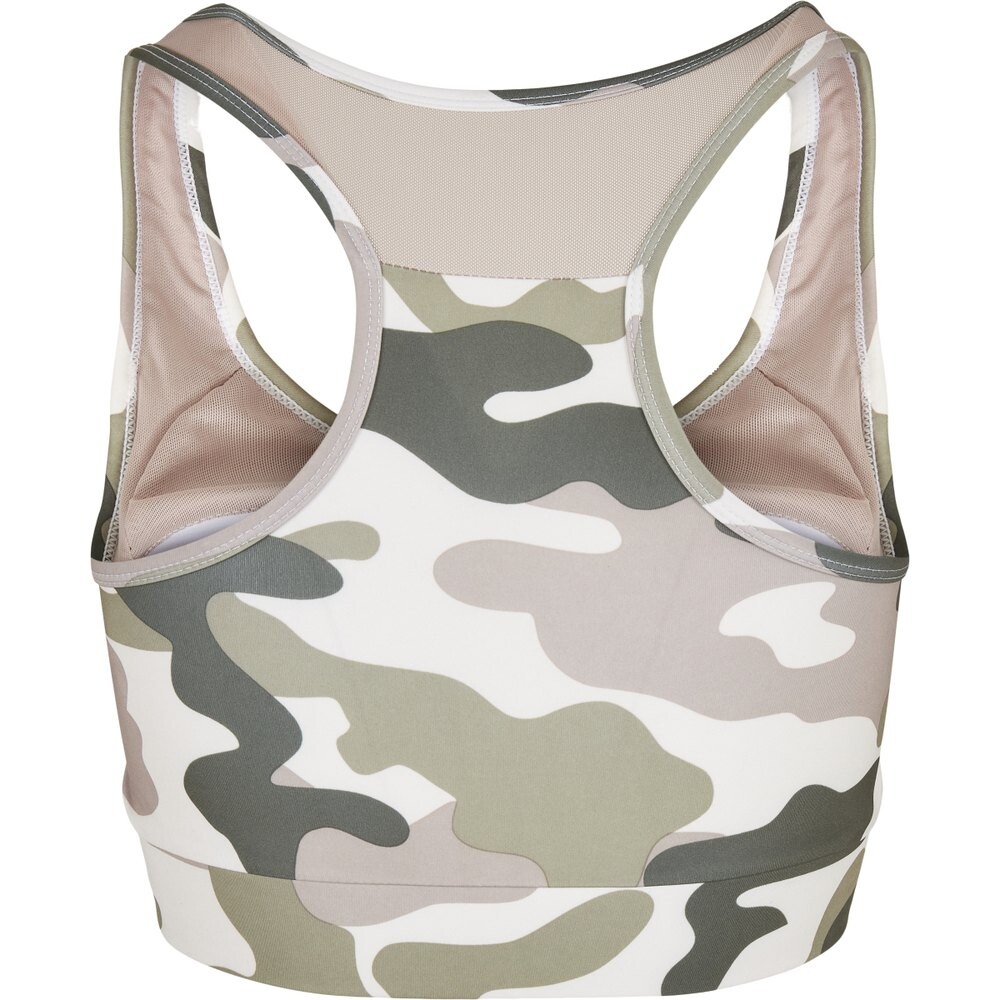 Этот женский спортивный бюстгальтер сочетает в себе захватывающий вид и идеальную посадку. Благодаря стильной спинке с продуманной сетчатой вставкой спинка остается свободной, а передняя часть украшена круглым вырезом. Спортивный стиль бюстгальтера Urban Classics дополнен модным камуфляжным рисунком. Превосходный комфорт обеспечивается за счет узкого кроя, вшитых чашек и эластичной ленты на внутренней стороне подола. Oberstoff 1: 77% Полиэстер, 23% Эластан, Эластичный трикотаж, 250 GSM.
