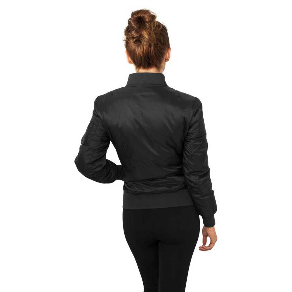 Женская базовая куртка-бомбер от Urban Classics привлекает внимание карманом на молнии на левом плече и внутренней подкладкой оранжевого цвета. Справа и слева спереди есть карманы.