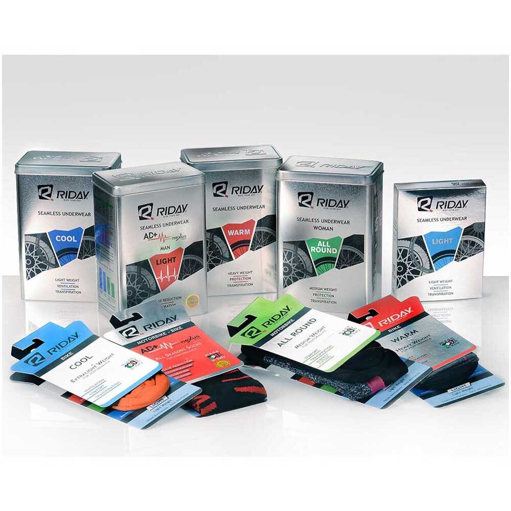 RIDAY предлагает полную линейку базового слоя и технических носков, разработанных для велосипедистов и мотоциклистов на каждый сезон. Оригинальные в своих простых и простых линиях, с техническими и функциональными деталями, которые делают изделия универсальными и практичными для городского использования, приключений и гонок.