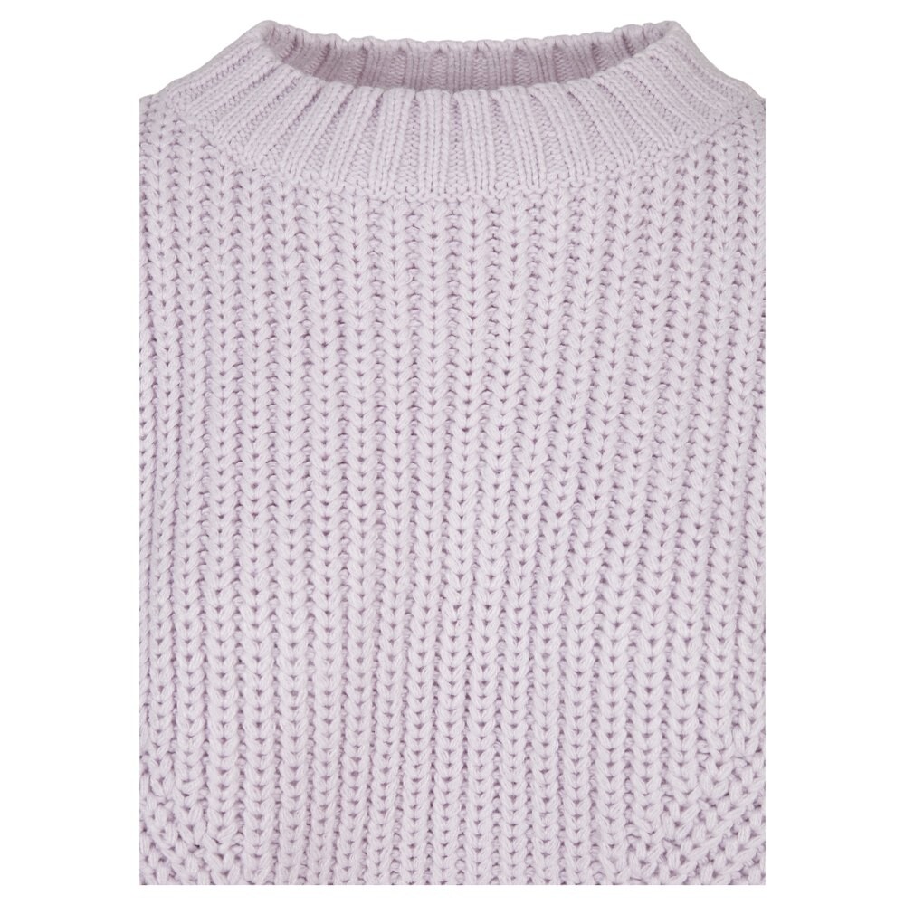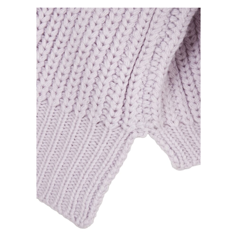 Стильный вязаный свитер имеет укороченный крой и удлиненную спинку, а также укороченные плечи и красивые широкие рукава. Повседневный образ крупной вязки становится еще более интересным благодаря стреловидным стежкам спереди. Рельефный вязаный воротник-стойка завершает образ.