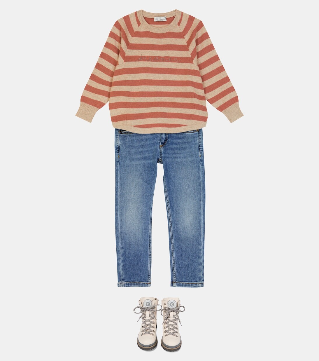 Этот полосатый свитер от Brunello Cucinelli Kids создан для малышей с богатым воображением. Он изготовлен из ультрамягкой шерсти, кашемира и шелка. и украшен очаровательной надписью «мечтатель», вышитой монили-бусами. Материал: 10% шелк, 30% кашемир, 60% шерсть. Сделано в Италии. Отделка: 100% латунь. Рекомендации по уходу: ручная стирка.