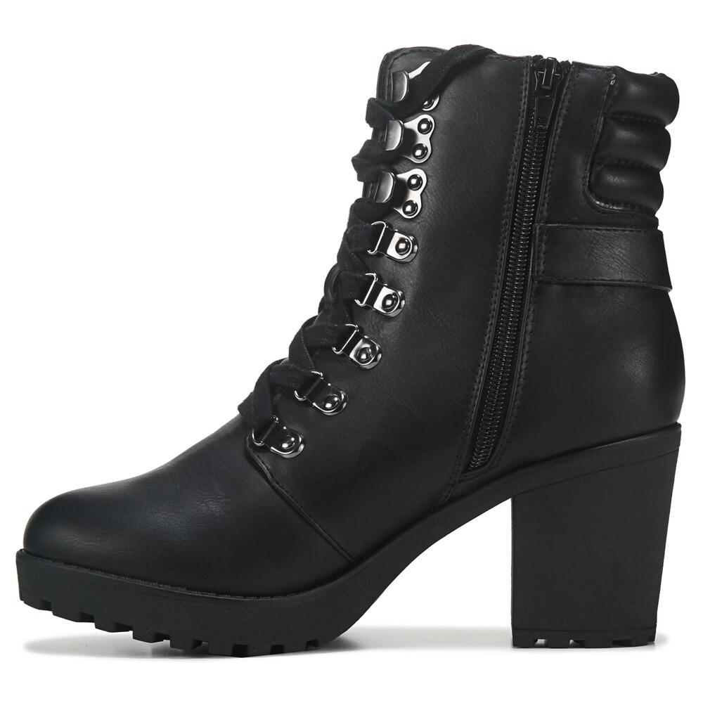 Чувствуйте себя уверенно, расхаживая с важным видом в женских боевых ботинках Mia Annamaria. Верх из искусственной кожи в стиле армейских ботинок с круглым носком. Застежка-молния сбоку. Шнуровка спереди с крючками для быстрой шнуровки. Мягкий воротник. Гладкая подкладка с мягкой стелькой. Прочная синтетическая подошва с выступами и блочный каблук высотой 2 дюйма.