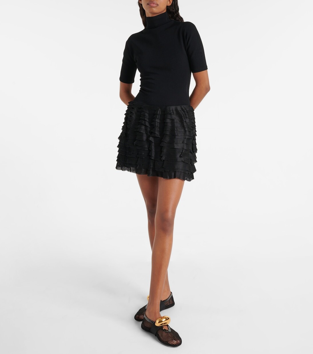 Мини-платье из джерси с высоким воротником и оборками Alaïa, черный 392 768₽