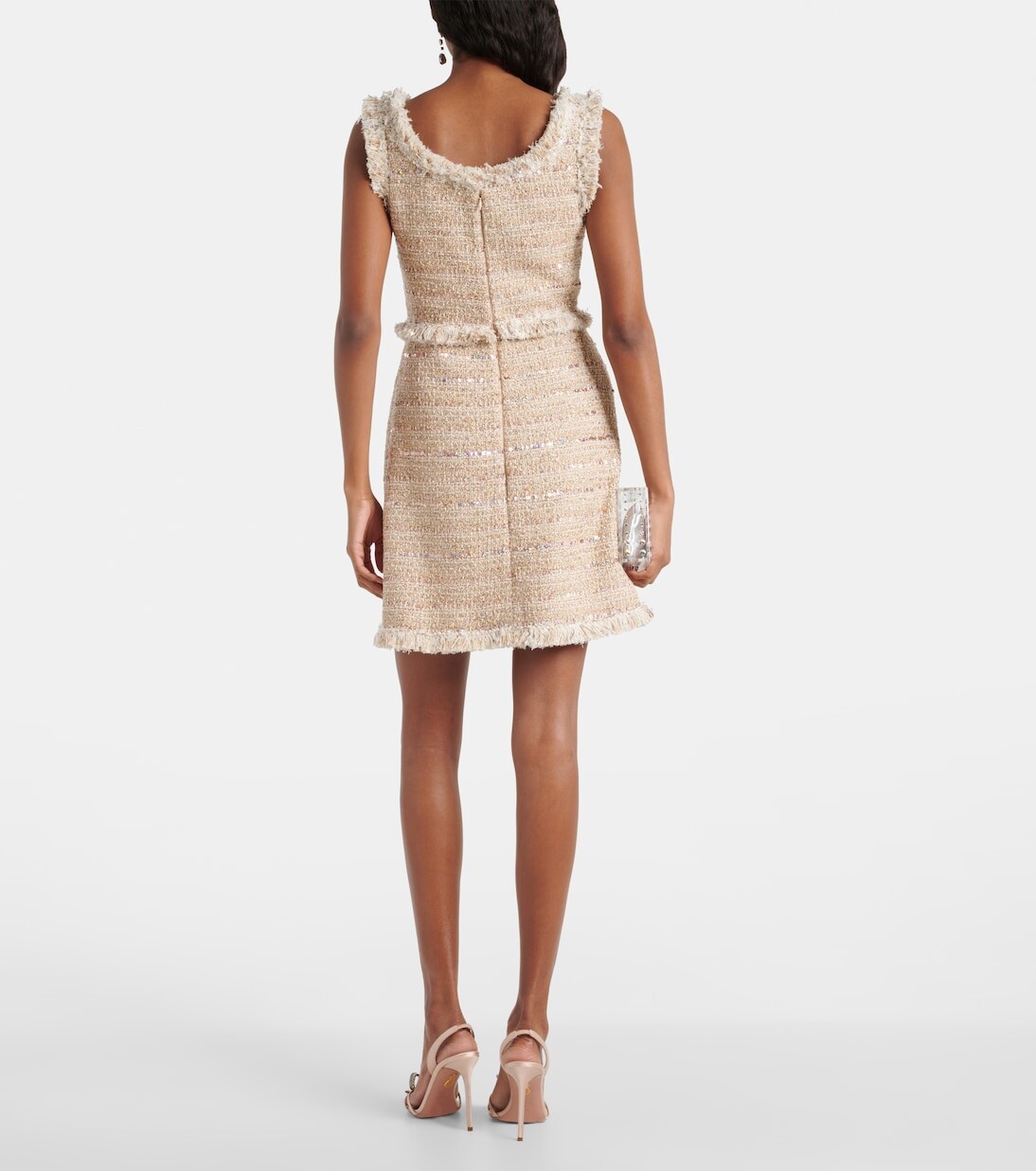 Материал: 51 % полиэстер, 28 % шерсть, 13 % полиамид, 6 % хлопок, 1 % другие волокна, 1 % металлические волокна. Отделка: 54 % хлопок, 20 % полиэстер, 16 % лен, 10 % полиамид. Застежка: молния сзади. Рекомендации по уходу: сухая чистка. Сделано в Италии. Подкладка: 100% шелк.