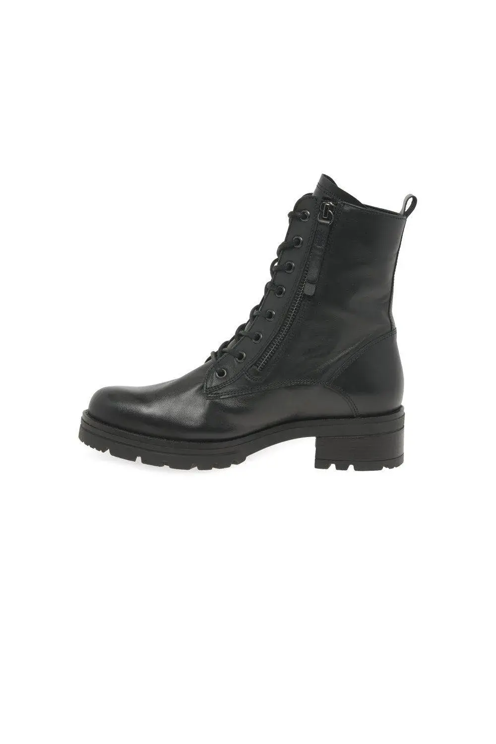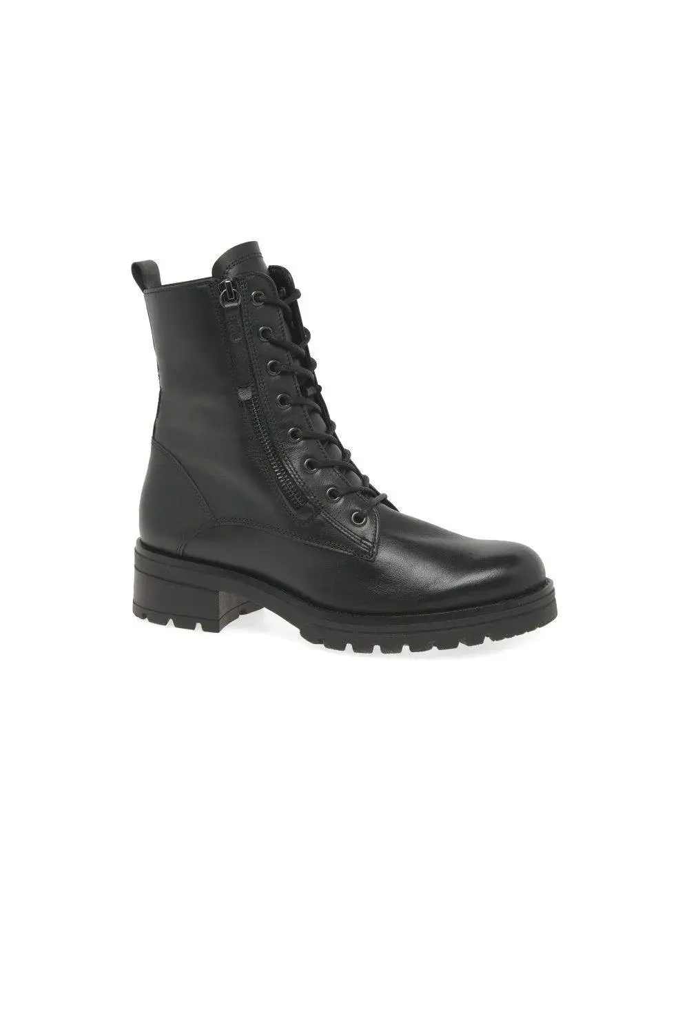 Gabor Serve — модная пара женских байкерских ботинок с кожаным верхом и золотистой металлической отделкой. Застежки-молнии и шнурки позволяют легко закрепить Serve и обеспечить удобную посадку.