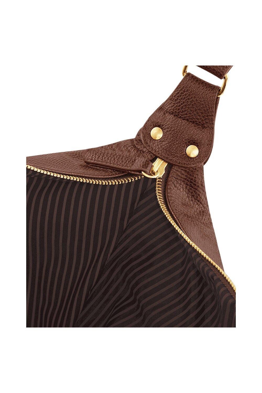 Полностью на подкладке из ткани в тонкую полоску. Концы застегиваются на кнопки. Металлическая фурнитура. Внутренний карман для ценных вещей. Внутренний плинтус. Удлиненная молния основного отделения для легкого доступа. Самостоятельные тканевые ручки для переноски. Можно носить в руке или через плечо. Размеры: 56 х 28 х 29 см. Материал: Натуральный полиуретан NuHide, имитирующий кожу.