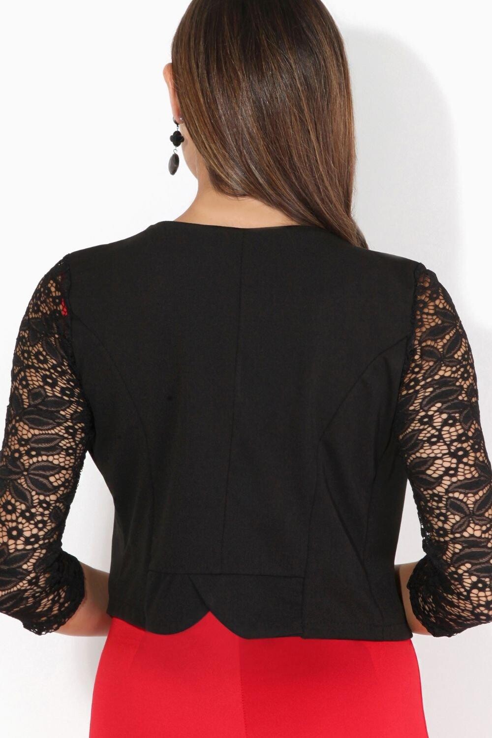 Эластичная фактурная ткань. Открытая укладка. Совок шеи. Изогнутый лацкан. Рукав 3/4 из прозрачного кружева (рисунок кружева может отличаться). Фигурный край переда. Заверните деталь на обратную сторону. Укороченная длина. 90% полиэстер; 5% Вискоза; 5% Эластан. Рекомендуется ручная стирка.