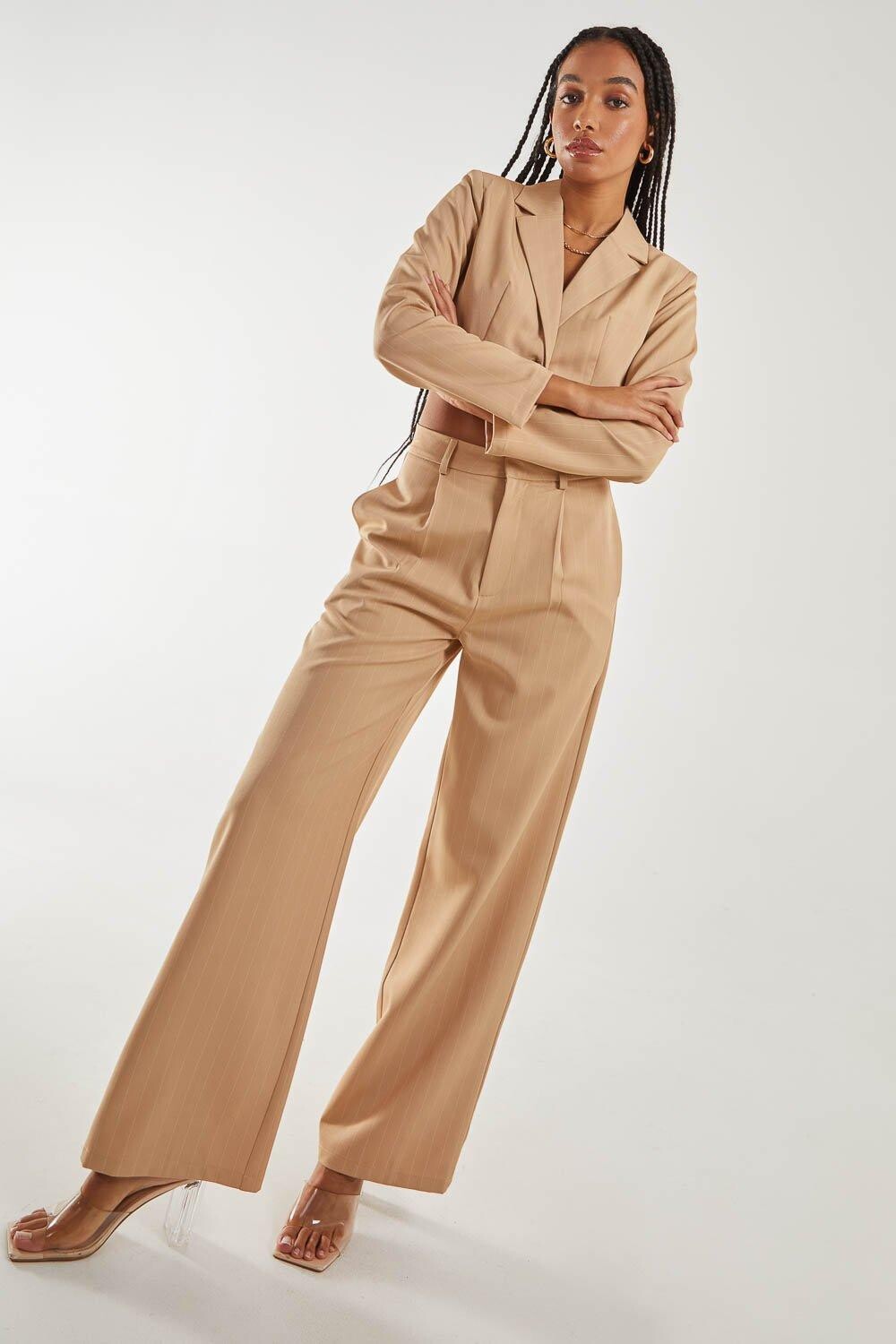 Нам не хватает комплектов из пиджака и брюк, и этот вариант в тонкую полоску станет идеальным сочетанием для классного офисного наряда или вы можете сделать его повседневным. Сочетайте с нашими широкими брюками в тонкую полоску.