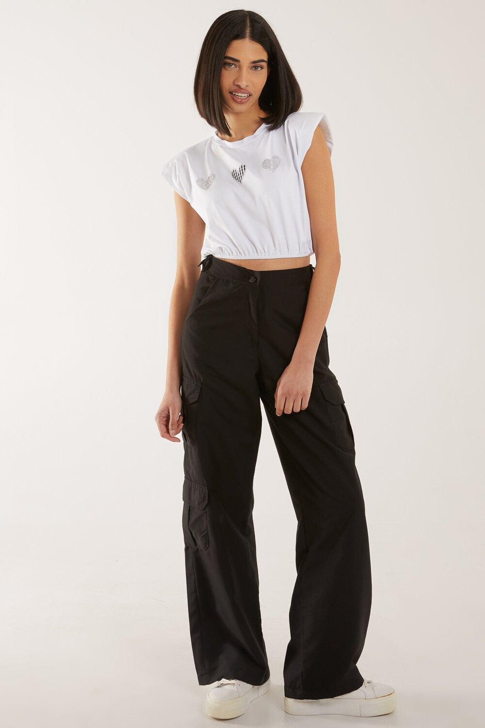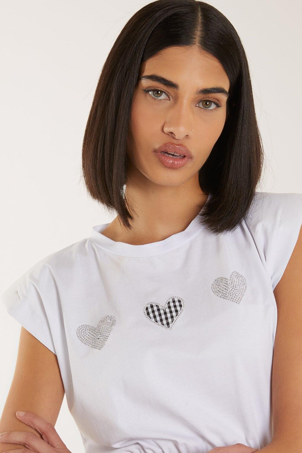 Этот белый топ с короткими рукавами отличается от обычного белого топа и украшен сердечками, придающими стильный вид.