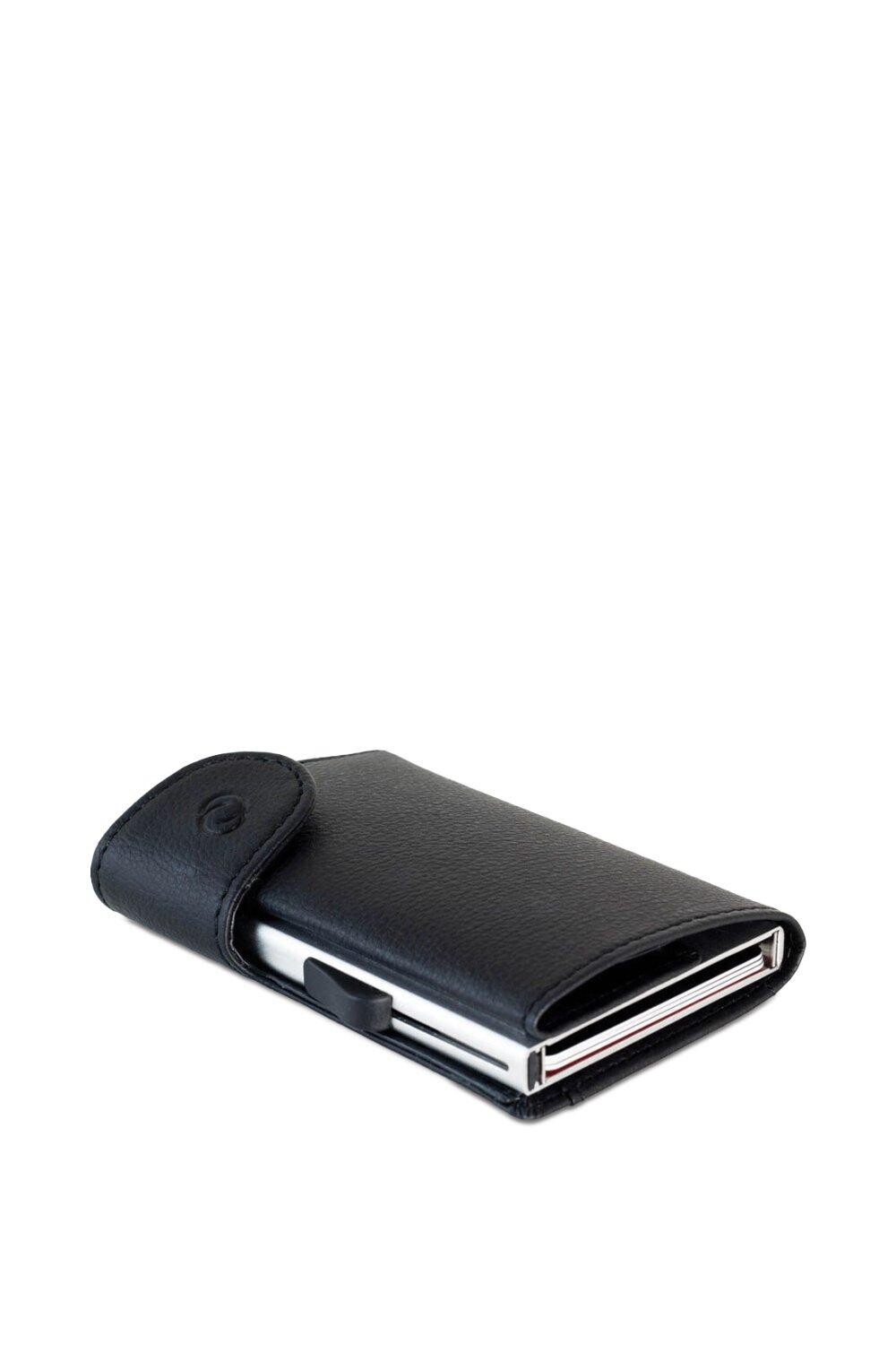 Экранирует RFID (радиочастотная идентификация) и NFC (связь ближнего радиуса действия). Этот кошелек вмещает до 6 карт в алюминиевой защищенной панели. Изготовлен из фактурной кожи, застегивается на кнопки. Нажимной рычаг обеспечивает легкий доступ к картам, не открывая кошелек. Размеры ок. 2,5 х 7,7 х 11,2 см