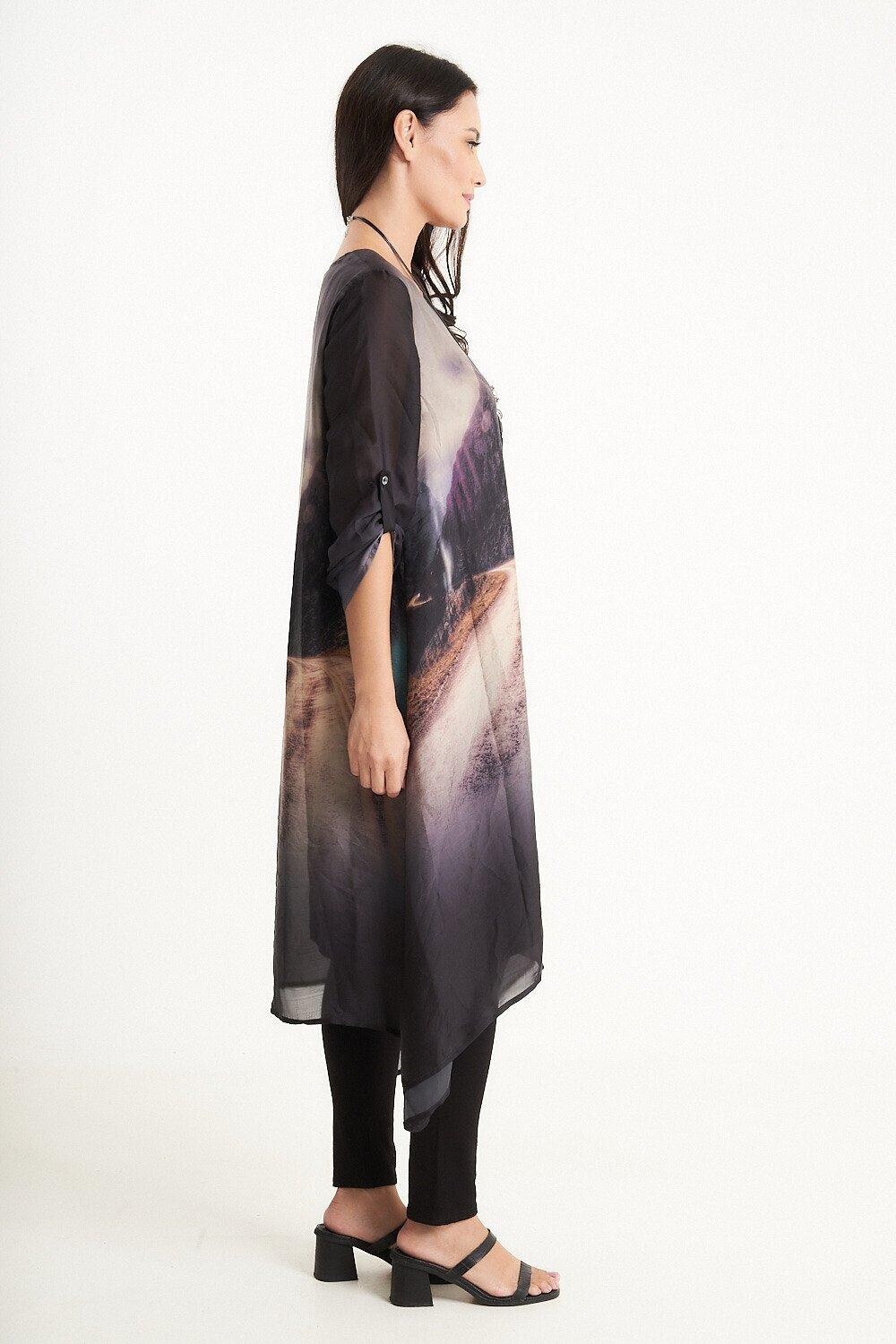 Это платье из ткани Mock Silk с великолепным абстрактным принтом ярких цветов и полностью на подкладке. Потрясающая вещь выделит вас из толпы. В комплекте ожерелье.