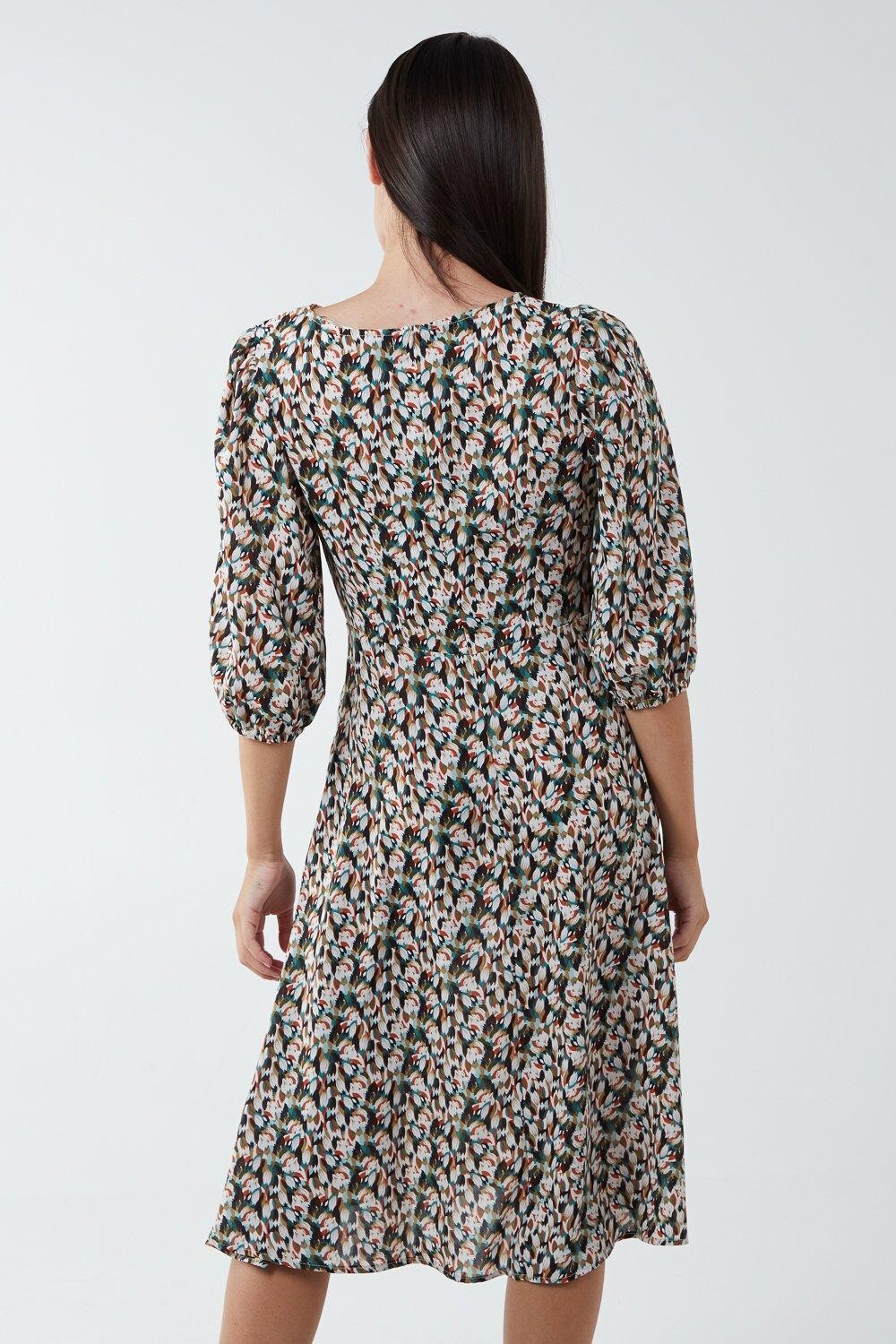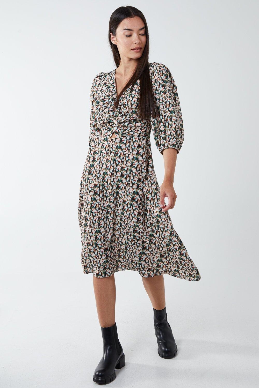 Платье с узелковым передом и принтом в виде росписи. Ночные выходы всегда будут веселыми с платьем с вырезом спереди с узлом, рукавами до половины, вырезом спереди и мини-длиной. Сочетайте это платье с черными ботинками.